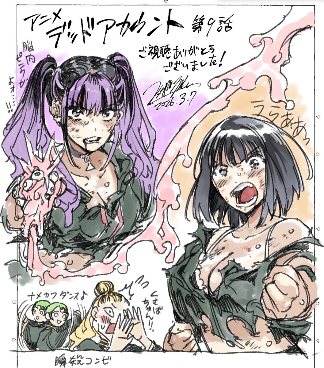 第9話、草場恵流と漆栖川希詠の対決がすごく印象的だったな~。恵流ちゃんは地雷系で、希詠ちゃんは粘着質って、性格が真逆なんだけど、一緒に戦うとまた違った魅力が出てきた気がする。特に服がビリビリになるシーンは、ちょっとエロい雰囲気で、思わずニヤニヤしちゃったよ。あと、輪狩実と縁城蒼吏の戦いも盛り上がっていて、特に蒼吏が優勢だったのは意外だった。次回の展開が楽しみだな。それに、草場ちゃんの好きなタイプが縁城と括って、ちょっとかっこいいよね。次回もよろしくお願いします!