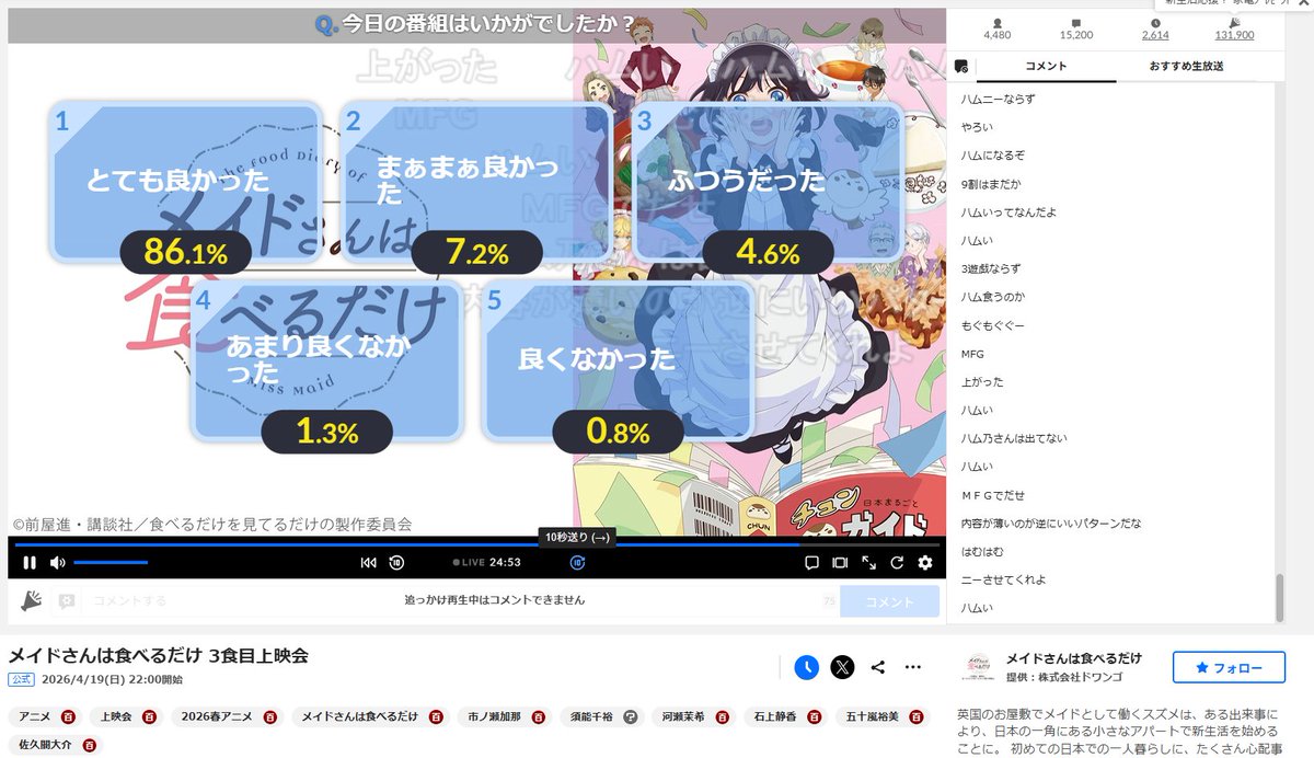 第3話のメイドさんは食べるだけ、すごく癒やされたな~。特にスズメちゃんがお塩入れるの怯えてる様子が可愛くて、思わず笑っちゃった。チュンのレトルト食品の解説も面白くて、料理の話題が豊富で楽しかった。お惣菜やかぼちゃ、たけのこ、こんにゃくなど、いろんな食材が登場して、食欲が湧いてきたよ。あと、夕食の匂いが美味しそうって言う投稿もあって、家にいるときの幸せな気分を思い出した。チュンとスズメちゃんの関係も優しくて、毎回のエピソードがほっこりするね。