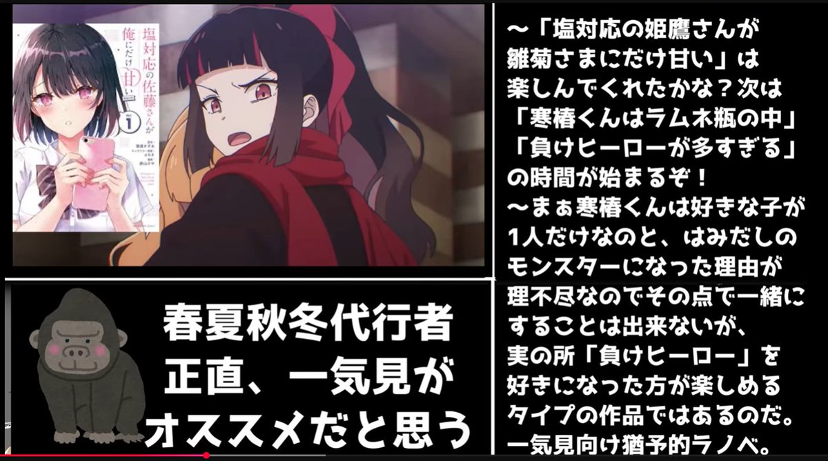 春の舞の第2話、OPとEDの映像がとても美しくて、本当に癒されました🌸 あの花びらが舞うシーンや、冬の歌が流れるエンドロール、どちらも心に残る印象的でした。特に、OPの「Petals feat. 夏背」の歌詞が心に響いたなあ。そして、この話の舞台が春という季節なのに、冬の代行者・寒椿狼星の物語も少しずつ明らかになっていくのが面白いですね。10年前の襲撃についての言葉が、今週の感動ポイントだったかも。狼星と凍蝶の関係性も、親子のように思える距離感がたまらなく好きです。あと、この2人の絡みが楽しみで、特に凍蝶の表情がとても優しくて、もうたまらないなあ。