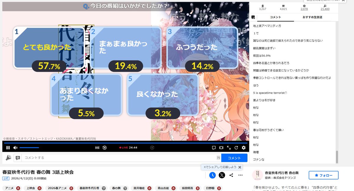 春の舞の第3話、本当にいろんなことが起こったね!OPの映像も美しくて、毎回癒される~🌸 さくらの顔が可愛くて、特にツリーのシーンはほっこりしたわ。雛菊とさくらのツーショットも好きだな。 それに、代行者のシステムがちょっと複雑で、なんで「当たり前」になってないのかなって思っちゃった。家族から引き剥がされるって、ちょっと切ないよね。 あと、四季庁の仕事ぶりも気になるところ。国家存続に不可欠なのに、ザル警備環境すぎるよ~。 でも、春の護衛官さんも萌に飢えてたみたいで、ちょっと笑ったわ。次回は第4話、楽しみだな!🌸
