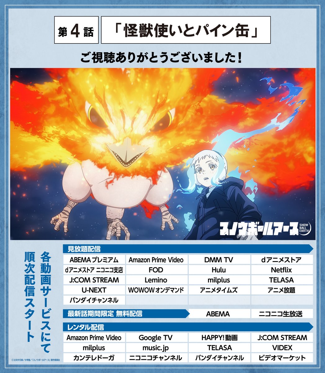 第4話、本当に面白かった!特に蒼と大地のコンビがいいね。蒼の過去が少しずつ明かされていくのが、胸が熱くなる感じ。あと、ミシマモールの秘密も気になってきたな。温泉が出てきたのも嬉しいポイント。それに、鉄ユキコンビの可愛さもたまらないよ。ユキオが目からオイル出すの、ほんと好き。そして、怪獣使いとパイン缶の話も、また違った魅力があって、見応えあったな。